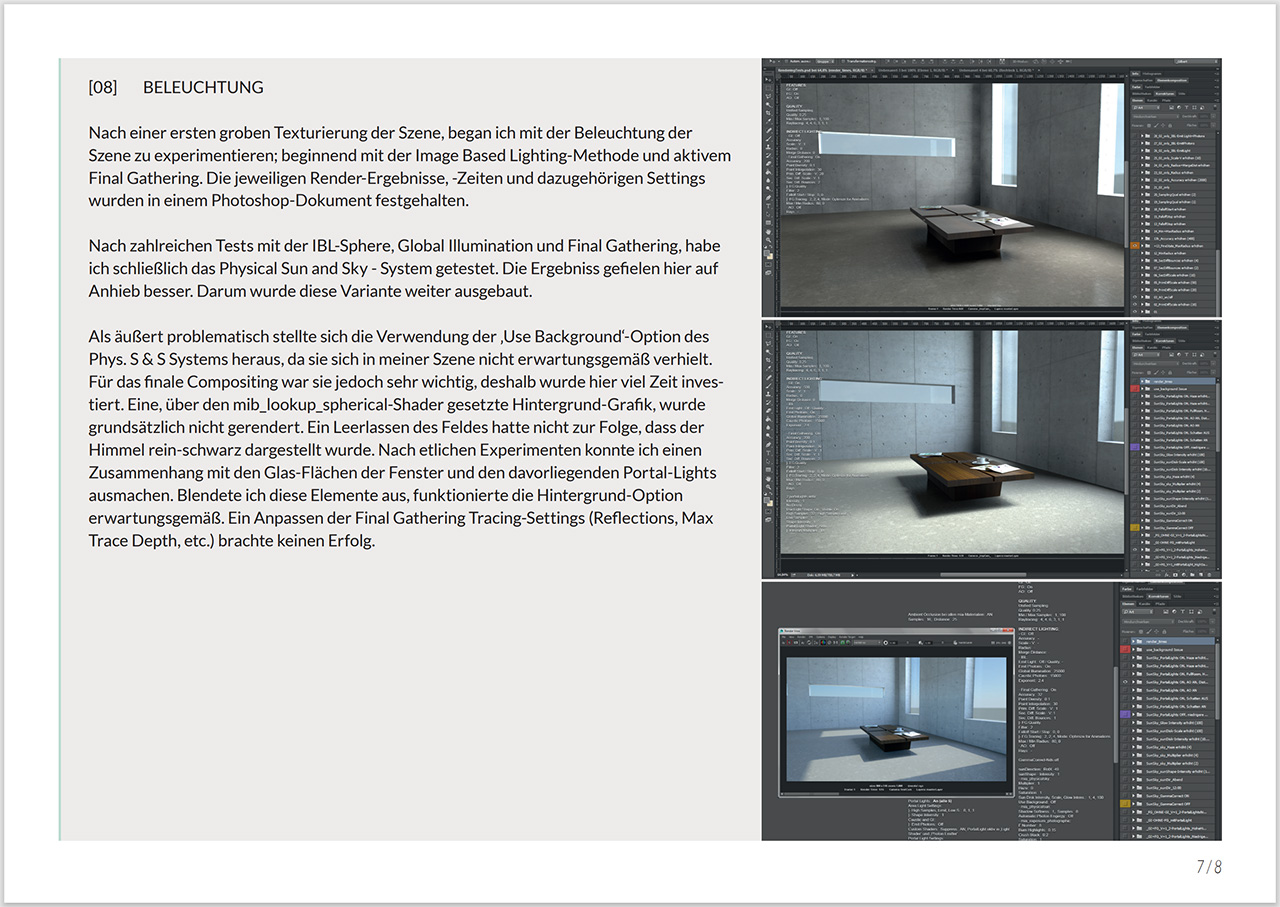 During my post-production master's course, we got tasked with creating an animated indoor architectural scene with realistic lighting in Maya. The focus of this exercise laid on composing, texturing and lighting a 3D scene - and less on modeling. I went for an industrial styled living room and used Mental Ray for rendering. For more details on the production process please refer to the linked documentation below.